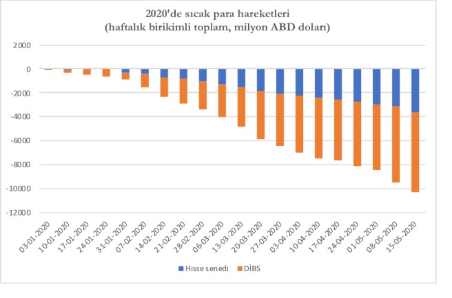 İkincisi, 2018 döviz krizi esnasında yaşanan dış sermaye çıkışının ardından 2019’un ikinci çeyreği hariç dış sermaye girişlerinin devam ettiğini görüyoruz. 2020’de ise durum yeniden tersine dönmüş ve üç ayda toplam 4.1 milyar dolarlık bir çıkış gerçekleşmiş. Yukarıdaki grafik bunun önemli bir kısmının hisse senedi ve devlet iç borçlanma senedi piyasalarından olduğunu göstermekteydi. Buna karşılık doğrudan yatırım girişlerinin düşük bir seviyede de olsa devam etmesi net çıkışın boyutlarını sınırlamış görünmekte. Bu istatistikler Mart sonuna kadar olan dönemi kapsadığı için hisse senedi ve tahvil piyasalarında Nisan ve Mayıs’ta yaşanan çıkış buraya henüz yansımamış durumda.