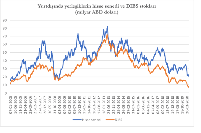 Böylelikle yurtdışında yerleşiklerin portföyündeki hisse senetlerinin toplam piyasa değeri 21 milyar dolara, DİBS’lerinki ise 7 milyar dolara kadar geriledi. Merkez Bankası’nın 2005’ten bu yana sunduğu verilere göre bu stoklar 2008 sonu-2009 başındaki seviyelere geriledi.