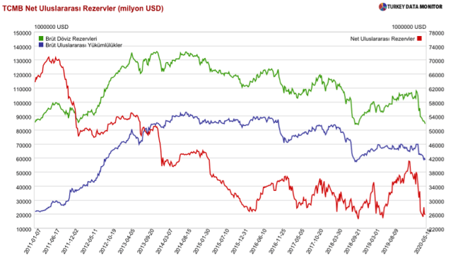 Kısacası, artan dış ticaret açığına sıcak para çıkışları, yerleşiklerin yurtdışına taşıdıkları sermaye ve net hata noksan kaleminde yer alan çıkışlar da eklendiğinde 2020’nin ilk üç ayında döviz talebinin çok hızlı bir biçimde arttığı görülüyor. Durum böyle olunca da yılın ilk üç ayında Merkez Bankası rezervlerindeki hızlı düşüş şaşırtıcı olmuyor. Ticaret açığının arttığı ancak dış sermaye girişlerinin tersine döndüğü bir dönemde oluşan döviz talebinin önemli bir kısmı Merkez Bankası rezervlerinden karşılanmış. Bu dönemde resmi rezervlerdeki azalma 2018 üçüncü çeyrekteki azalmanın bir hayli üzerinde gerçekleşmiş durumda. Net rezervlerde 2019’da kaydedilen sınırlı artış ise 2020’de tamamen kaybedilmiş görünüyor.