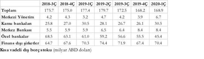 Türkiye ekonomisinin önümüzdeki 1 yıl içerisinde ödemesi gereken toplam borç stoku 2020 Mart sonu itibariyle 168.9 milyar dolar. Bunun 30.5 milyar doları kamu bankalarına, 45.4 milyar doları da özel bankalara aitken finans dışı özel sektör şirketlerinin 70.4 milyar dolar kısa vadeli dış borç stoku mevcut. 2018 döviz krizinden bu yana özel bankaların kısa vadeli dış borç stokunda azalma sürerken kamu bankaları ile Merkez Bankası’nın kısa vadeli dış borç stoku artış göstermiş.