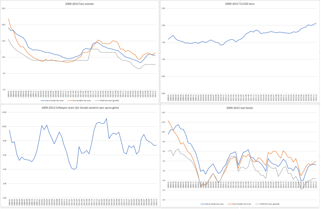 ABD’deki finansal krizin daha önce görülmemiş boyutlarda bir çöküşe yol açacağını gören Fed, faiz oranlarını sıfıra çekmenin de yetersiz kalması karşısında geniş çaplı bir finansal varlık alım programı başlattı. İngiltere, Japonya ve Avrupa merkez bankaları da benzer programları devreye soktular. Bu programlar sonucu küresel finansal piyasalarda daha önce görülmemiş boyutlarda bir likidite genişlemesi yaşanırken, bu likiditenin bir kısmı yine Türkiye ve benzeri ülkelere akmaya başladı. Nitekim bu dönemde Türkiye’ye rekor düzeyde dış sermaye girişi oldu. Türk lirası değer kazanırken 2009’dan itibaren faiz oranları da yakın tarihteki en düşük seviyelerine geldi. Mart 2009’da 1.70’i gören dolar kuru, uzun süre 1.50 civarında hareket ettikten sonra 2013 başlarında tekrar 1.70’in üzerine çıktıysa da bu dönemde de TL reel olarak değerli seyretmeye devam etti. 2009-2013 dönemi, faizlerin de oldukça düşük seviyelere gerilediği, reel faizlerin zaman zaman sıfıra yaklaştığı ve hatta altına indiği bir dönem oldu. Bu dönemde TL’nin değerli seyretmesi, düşük reel faiz oranlarına rağmen enflasyonun düşük kalmasını sağladı.