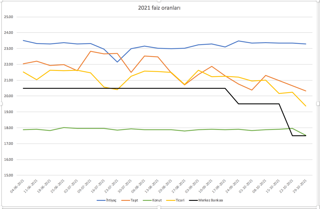 Üçüncüsü, Merkez Bankası’nın faiz indirimleriyle birlikte ticari kredi faiz oranlarında bir miktar düşüş gözlemliyoruz. Eğer bu faiz indirimlerinin amaçlarından birisi borçla dönen küçük ve orta ölçekli işletmelerin finansman maliyetlerini düşürmekse bunun bir ölçüde sağlandığı iddia edilebilir. Ancak finansman maliyetleri aşağıya çekilirken kurdaki ve enflasyondaki sert yükseliş sonucu girdi maliyetlerinde ortaya çıkan artışın finansman maliyetlerinde elde edilen düşüşten daha fazla olabileceğini akılda tutmakta fayda var.