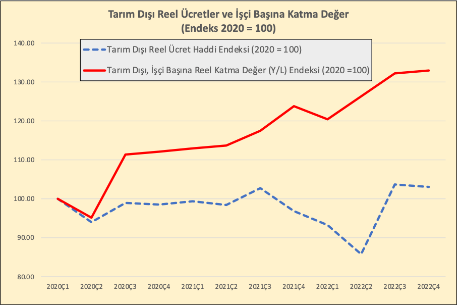İşsizlik oranlarının zaten çok yüksek olduğu ve son birkaç yılda emek gelirlerinin muazzam bir aşınmaya uğradığı bir ülkeden söz ediyoruz. Aşağıdaki grafikte de görüldüğü üzere işçi başına katma değer üretimi artmaya devam ederken bu üretimden çalışanların aldığı pay 2020 ve 2021’de düşmüş, 2022’deki görece düşük artışa rağmen makas açılmıştır (2). Dolayısıyla istihdamı artıracak ve aynı zamanda reel gelir kayıplarını telafi edecek politikalar uygulanmadığı sürece faiz artışları ile yakalanacak istikrar geniş kitleler için ekonomik açıdan pek anlamlı olmayacaktır.