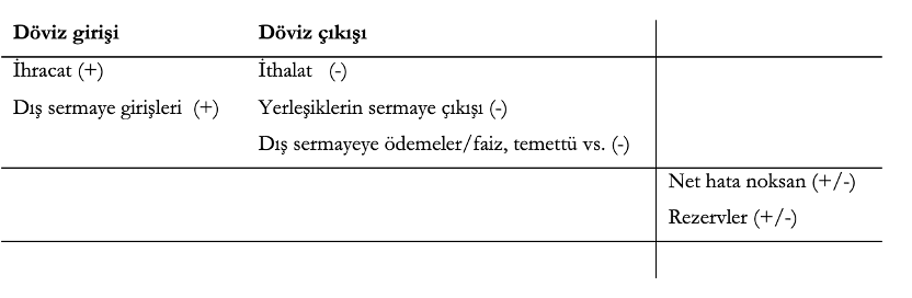 Türkiye’nin ödemeler dengesi hesaplarında en önemli döviz girişi kalemleri, ihracat gelirleri ve dış sermayenin Türkiye’de yaptığı yatırımlar ile özel sektör ve hükümete verdikleri borçlardır. Önemli döviz çıkışı kalemleri ise ithalat giderleri, yurtiçinde yerleşiklerin yurtdışında yaptığı yatırımlar ve Türkiye’ye yatırım yapan yahut borç veren dış sermayeye yapılan faiz ve kâr payı gibi ödemelerdir. Çoğu ülke için istatistiki yanılma payını gösteren “net hata noksan” kalemi de Türkiye için oldukça uzun bir süredir önemli bir gösterge haline gelmiştir. Bu kalemin önemli bir kısmının kayıt dışı döviz giriş ve çıkışları olduğu tahmin edilmektedir.