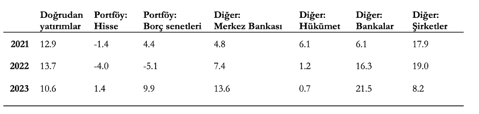 Bu resme göre, doğrudan yabancı yatırımlar son 3 senede oldukça istikrarlı bir görünüm sergiliyor. 2021’de 12.9 milyar dolar, 2022’de 13.7 milyar dolar ve 2023’te 10.6 milyar dolar bu kalemden girmiş. Yabancıların konut alımlarının da bu kalemde rapor edildiğini ve son yıllarda doğrudan yatırımların önemli bir kısmını oluşturduğunu da akılda tutmak lazım.