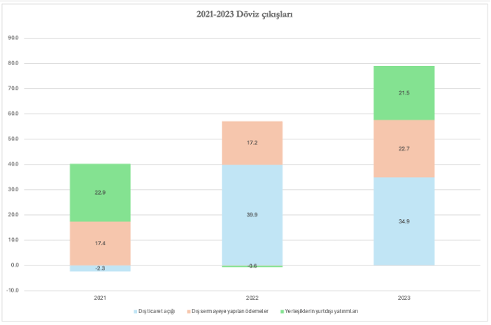 Bu verilere göre, 2021-2023 döneminde giren dövizin 72.5 milyar doları dış ticaret açığını finanse etmiş. Türkiye’nin dış ticaret açığının kısmen daraldığı bir dönemde de olsa döviz çıkışlarının en büyük nedeni dönemin bütününde dış ticaret açığı olmuş.