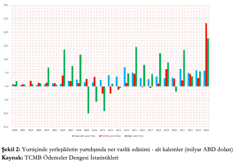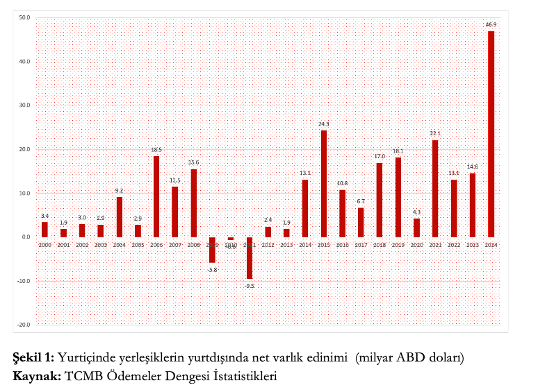 Ancak, özellikle 2000’li yıllardan itibaren, finans hesabından döviz çıkışları da önemli seviyelere ulaşmış durumda. Kasım 2024 Ödemeler Dengesi İstatistikleri’ne göre, yurtiçinde yerleşiklerin yatırım amacıyla yurtdışına çıkardığı toplam miktar Ocak-Kasım 2024 döneminde rekor kırarak 47 milyar dolara dayandı. Daha önceki en yüksek çıkışlar, 2015’te 24.3 milyar dolar ve 2021’de 22.1 milyar dolar seviyesinde gerçekleşmişti. 2024’teki çıkışlar, bu miktarların neredeyse iki katına ulaşmış.