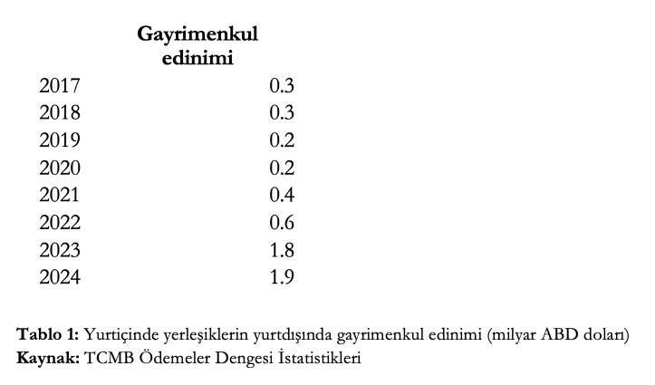 Öte yandan, Merkez Bankası, 2017’den itibaren yurtiçinde yerleşiklerin yurtdışında gayrimenkul alım istatistiklerini de yayımlamaya başladı. Buna göre yerleşiklerin yurtdışında gayrimenkul alımları da 2024’te 2 milyar dolarla rekor kırmış durumda.