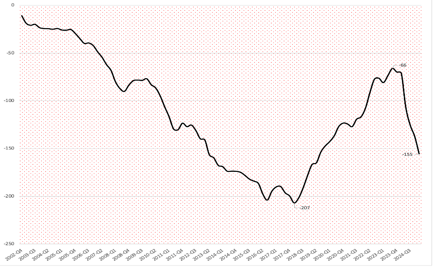 Asıl dikkat çekmek istediğim nokta, Şimşek’in göreve başladığı dönemde -60 ila -70 milyar dolar arasında dalgalanan net döviz pozisyonunun, iki seneden daha kısa bir zamanda oldukça hızlı bir şekilde bozulup -155 milyar dolara ulaşmış olması. Şubat 2025 itibariyle şirketlerin toplam döviz varlıkları 163 milyar dolara yakınken toplam döviz yükümlülükleri 318 milyar doların üzerinde. Bu yükümlülüklerin 122.4 milyar doları ise kısa vadeli yükümlülükler olarak sınıflandırılıyor.