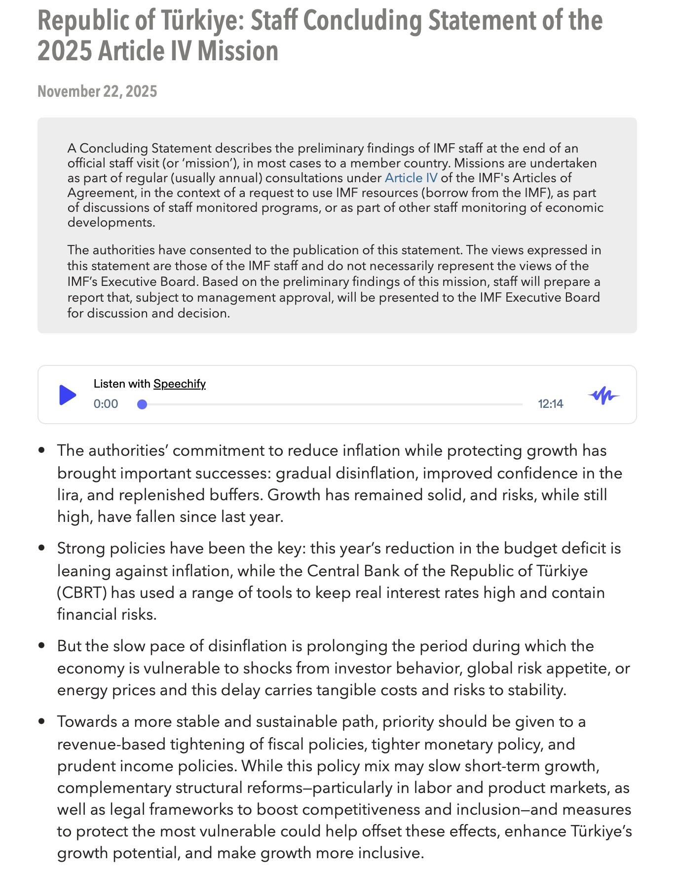 IMF’nin önerileri yine aynı: daha yüksek faiz, daha az kamu harcaması, daha düşük ücretler. sermayenin kârlarını ve finansal getirileri koruyan bu çerçeve, Şimşek politikalarıyla bire bir örtüşüyor: Faizleri yüksek tut, büyümeyi ve istihdamı ikinci plana at, kamu harcamalarını kıs, vergileri artır, reel ücretleri baskıla. Yine de dezenflasyondaki sınırlı başarıya karşın Türkiye ekonomisinin hâlâ hem iç hem dış şoklara karşı kırılgan olduğunun IMF tarafından da tespit edilmesinin önemli olduğu söylenebilir. Ama başlıktaki soruya geri dönersek, IMF’nin Türkiye’yi övmesinin ana nedeni, yeterince sert bulmasalar da tam da IMF yaklaşımı ile uyumlu politikaların devrede olmasıdır. Özellikle de yabancı yatırımcılara yüksek getiri sunan yüksek faiz politikası, geniş kesimler üzerindeki vergi yükünü artıran maliye politikası ve reel ücretlerin mümkün mertebe bastırılması konularında.